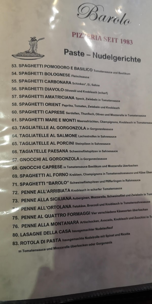 As a reviewer looking back over the menu of Ristorante Pizzeria Barolo Berlin, I’m left with the impression of a classic Italian restaurant that confidently covers all the essentials while offering enough variety to satisfy different tastes. The cold starters, such as Carpaccio Di Manzo, Carpaccio Di Salmone, Prosciutto E Melone, Mozzarella Caprese, and Insalata Mare, set a refined and fresh tone, while warm antipasti like Antipasti Mista, Broccoli Gratinati, Pecorino Al Forno, Funghi Ripieni (2 Stück), and Broccoli Al Gorgonzola add comforting depth. The soup selection, including Minestrone, Zuppa D'Aglio, Zuppa Di Pesce, Crema Di Broccoli, and Crema Di Pomodori, feels well-balanced and traditional. Salads such as Insalata Grande Mista (Groß), Insalata Grande Al Tonno (Groß), Insalata Grande Al Pecornio (Groß), Insalata Barolo (Groß), and Insalata Con Pollo (Groß) work well as lighter mains or accompaniments. Pizza lovers can rely on familiar favorites like Pizza Margherita, Pizza Napoli, Pizza Salami, Pizza Prosciutto, and Pizza Funghi, while pasta classics such as Spaghetti Pomodoro E Basilico, Spaghetti Bolognese, Spaghetti Diavolo (Scharf), Spaghetti Amatriciana, and Spaghetti Orient provide hearty comfort. The meat and fish sections are especially extensive, ranging from pork dishes like Scaloppa Milanese and Cordon Bleu, to beef options such as Bistecca Alla Griglia and Filetto Al Pepe, lamb specialties like Agnello Alla Contadina (Scharf), poultry dishes including Pollo Milanese and Pollo All Griglia, and seafood highlights such as Salmone Alla Griglia and Pesce Misto Alla Griglia. Additions for children, classic sides, indulgent desserts like Tiramisu and Cassata, and a solid selection of drinks round out the experience, making the menu feel complete, traditional, and well-suited for both casual meals and relaxed dinners.